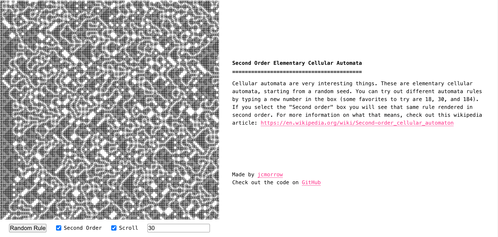 An exploration of second-order cellular automata using HTML canvas.